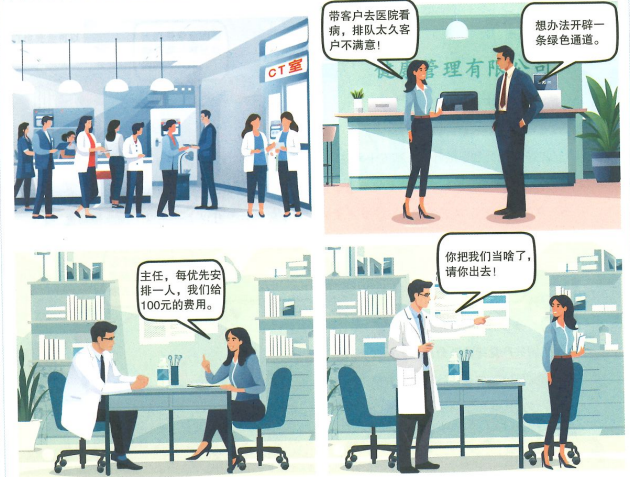 就医秩序关系患者就医体验感、获得感和幸福感,挂号、预约、候诊是就医最正常不过的流程,本是患者就医普遍遵循的准则。然而,一些健康管理公司为了提升客户满意度,通过拉拢腐蚀医院工作人员优先安排检查,严重破坏公平的就医秩序。
