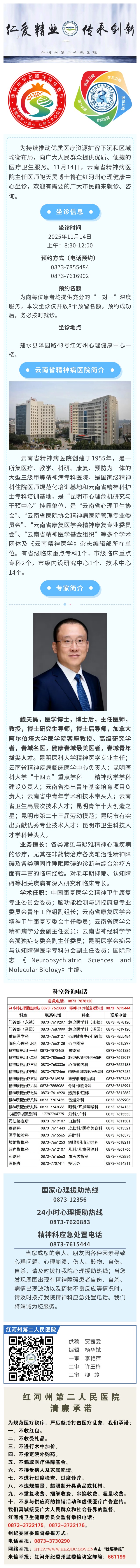 【省级名医坐诊预告】云南省精神病医院鲍天昊主任医师将到红河州第二人民医院院坐诊