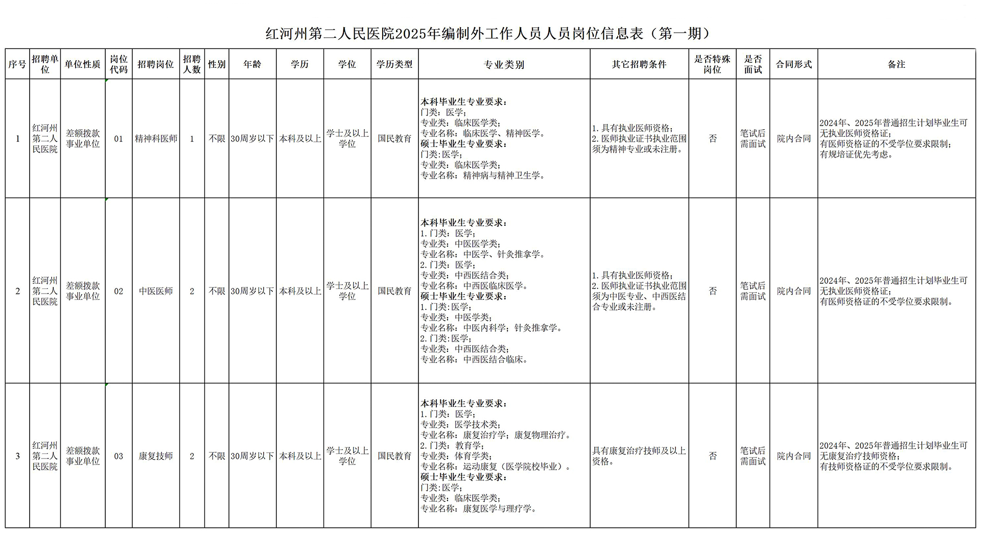 详见红河州第二人民医院2025年公开招聘合同制人员岗位信息表第一期(附件1),专业类别详见《硕士、本科专业目录》(附件2)。